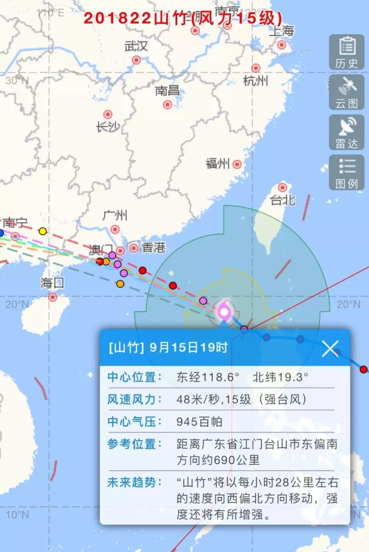 9月15日下午7點(diǎn)山竹步步逼近,最大中心風(fēng)力已經(jīng)達(dá)到恐怖的十七級!風(fēng)力最大的風(fēng)圈將把深圳市整個(gè)包裹進(jìn)去!